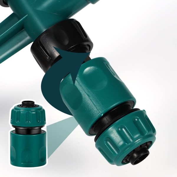 Mit den doppelten Wasserschlauchdüsen von ROTOSPRITZ können Sie mühelos mehrere Sprinkler anschließen, um größere Flächen zu bewässern. Schließen Sie einfach zwei oder mehr ROTOSPRITZ-Geräte für eine doppelseitige Bewässerung an und stellen Sie sicher, dass Ihr gesamter Garten die perfekte Wassermenge erhält. Diese nahtlose Verbindung ist ideal für große Rasenflächen und weitläufige Gartenbeete.