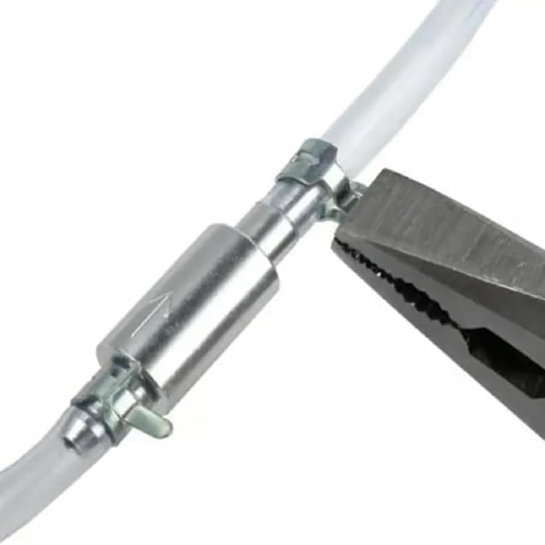 Das Anschließen des Schlauchs an das Bremssystem Ihres Motorrads ist dank der mitgelieferten Clips kinderleicht. Diese schnelle Einrichtung ermöglicht es Ihnen, den Entlüftungsvorgang der Bremsflüssigkeit sofort zu starten.