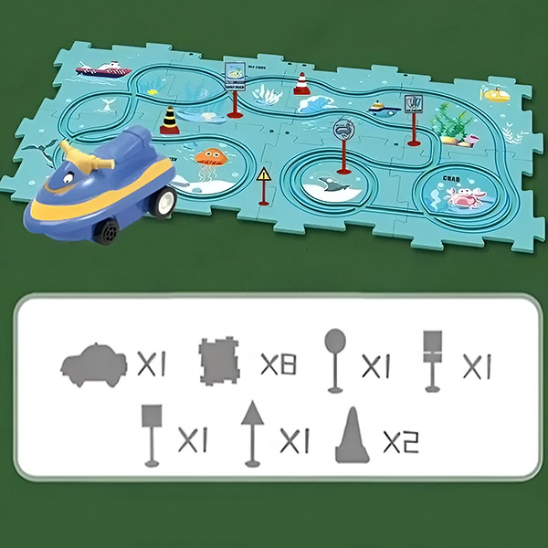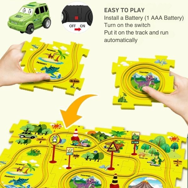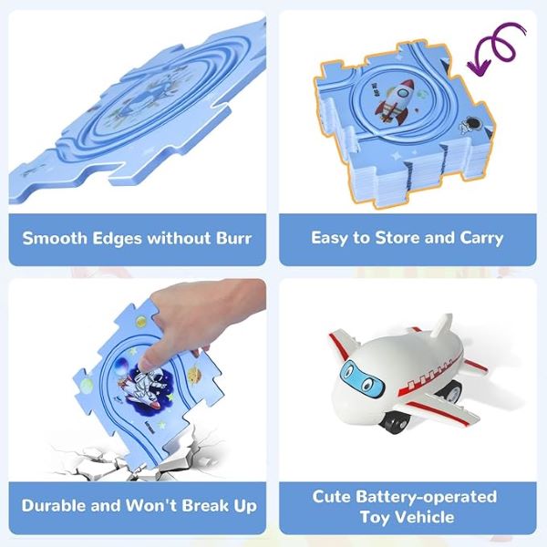 Das set enthält mehrere streckenteile, mit denen kinder ganz einfach verschiedene layouts erstellen können, was ihre kreativität und problemlösungsfähigkeiten fördert.