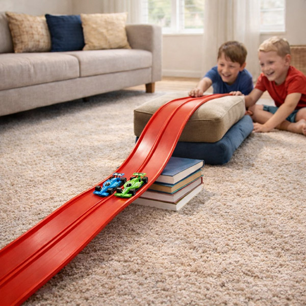 Kinder können die Strecke mit Alltagsgegenständen gestalten und Sprünge, Tunnel und Loopings bauen. Das fördert Fantasie und Problemlösungsfähigkeiten statt eintönigem Spiel und hält Kinder stundenlang ohne Bildschirm beschäftigt.
